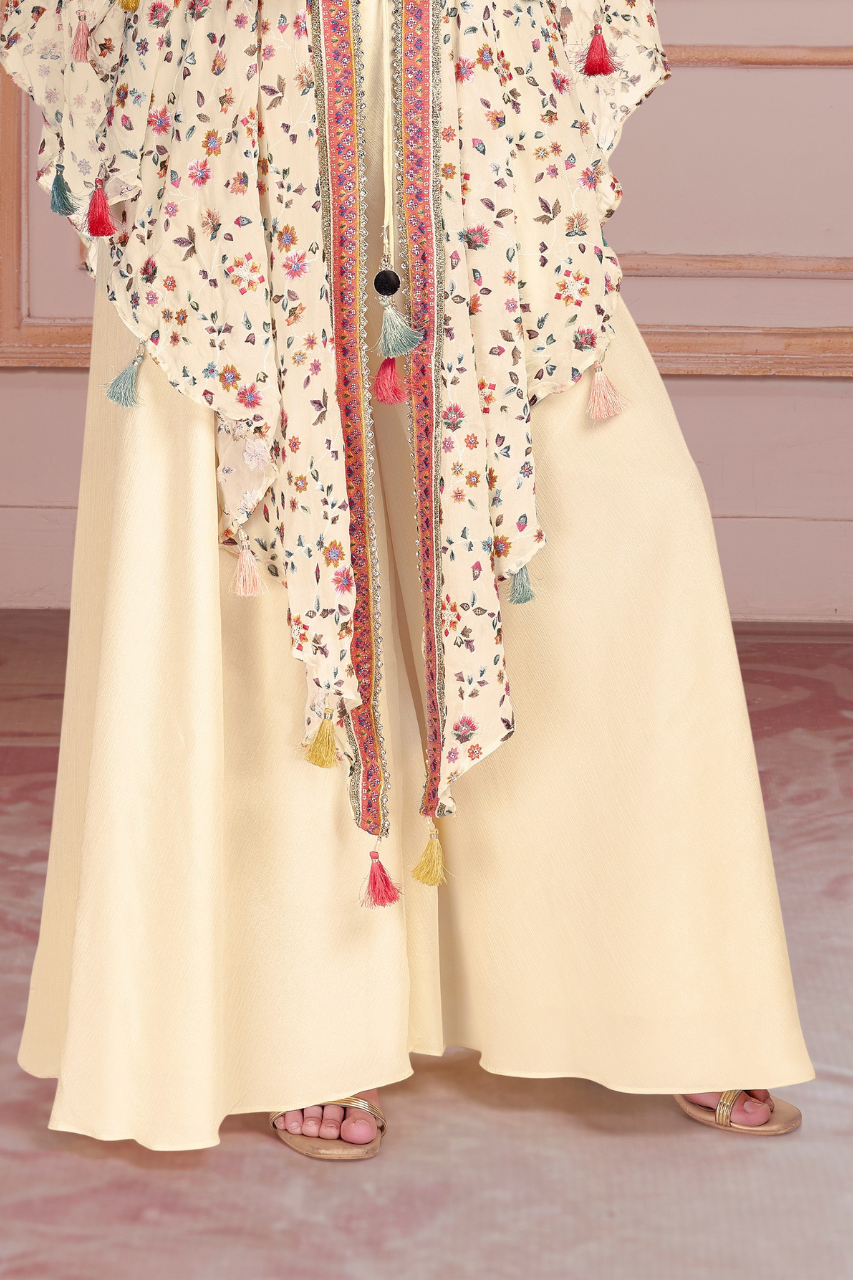 Expertly designed, this buttermilk cape pallazo set features elegant floral patterns. With its flattering silhouette and soft, lightweight fabric, it offers effortless style and comfort. The cape adds a touch of sophistication, making it a versatile option for any occasion. Upgrade your wardrobe with this stunning set.
